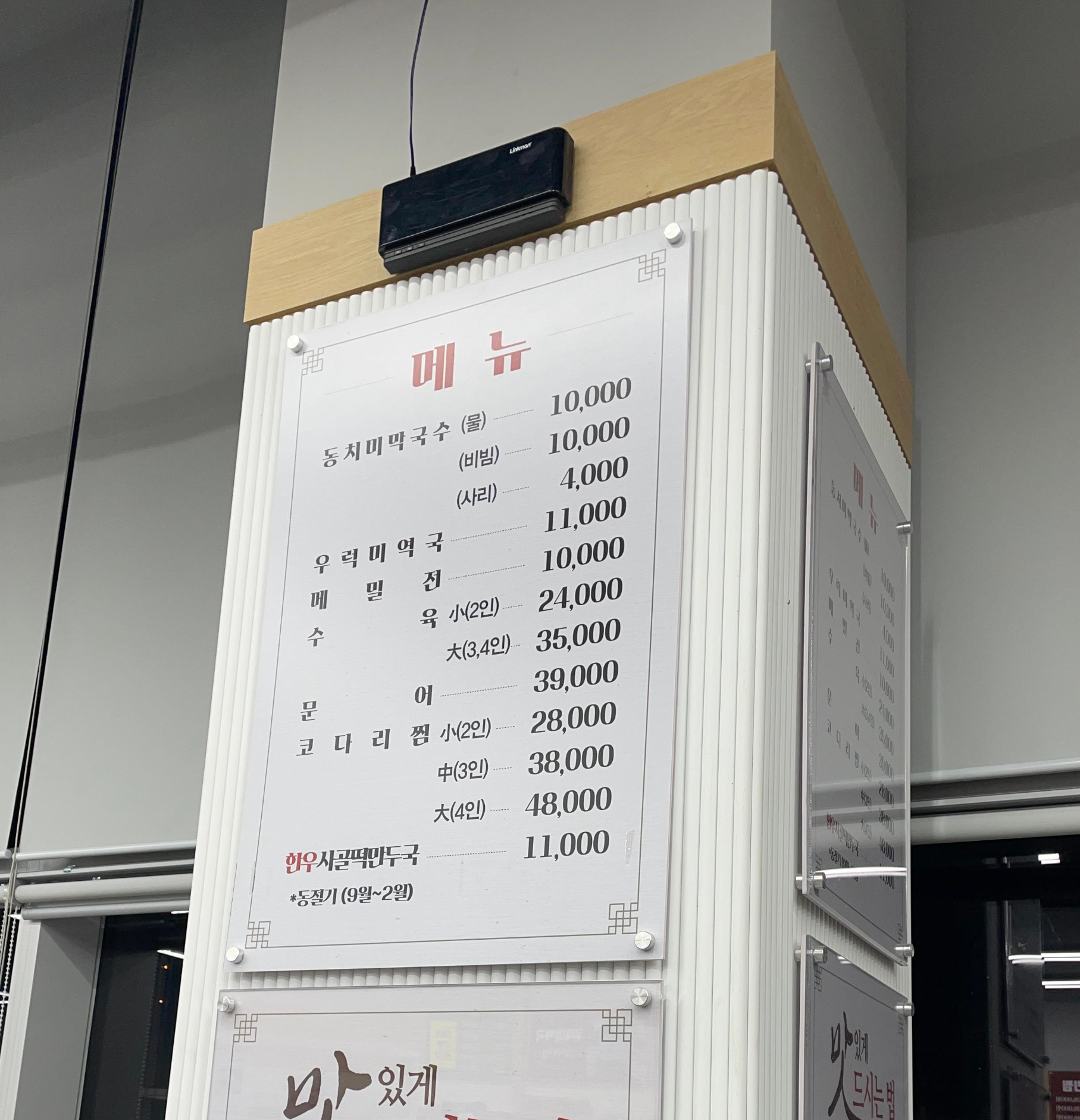 강릉동치미막국수 과천점의 메뉴판. 우리는 먼저 수육, 코다리찜을 대자로 하나씩 주문했다.