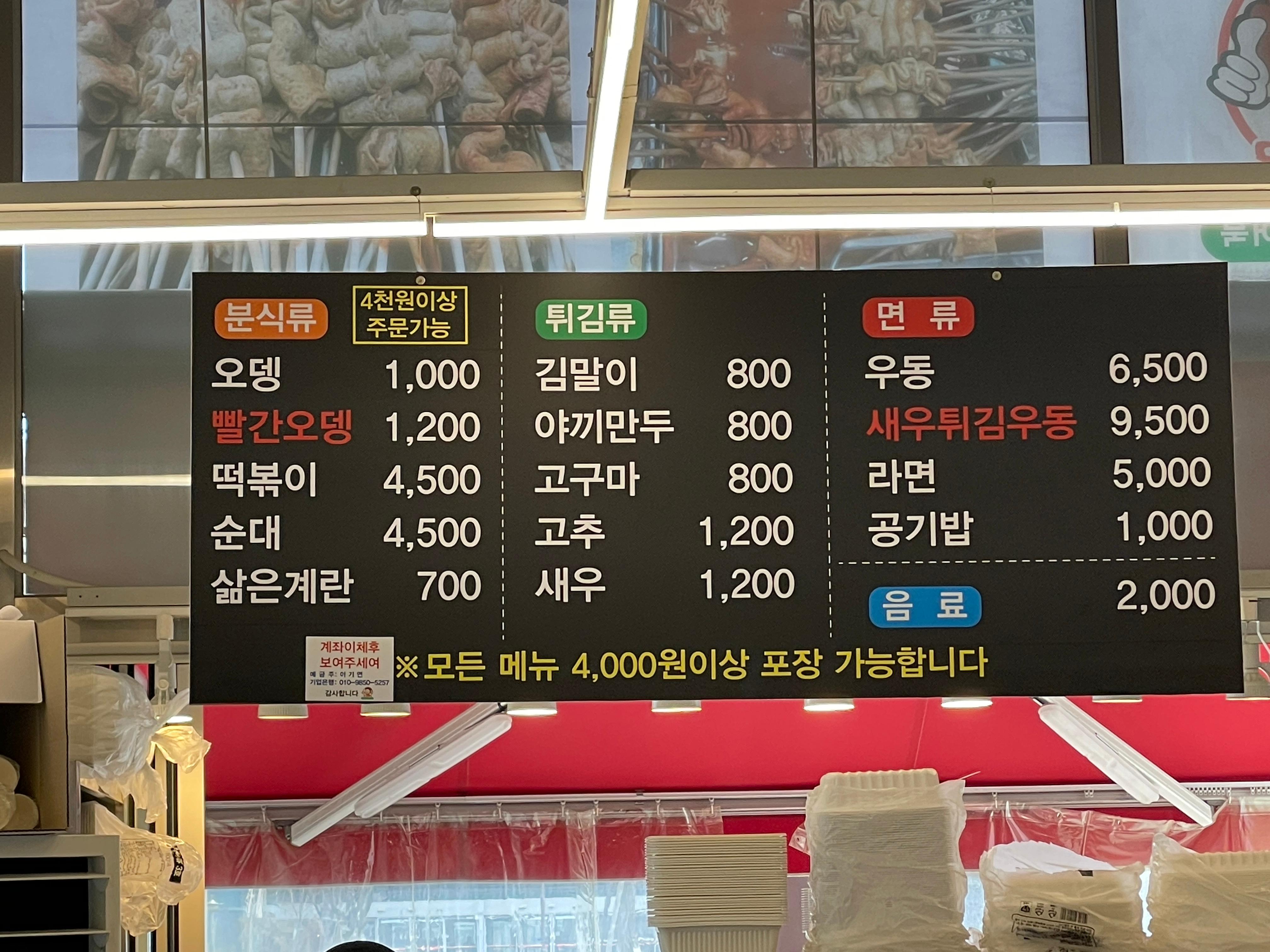 메뉴판. 우리는 오뎅1, 빨간오뎅2, 떡볶이1, 순대1, 김말이2, 우동1주문했다. 아이랑 같이 먹으니 뭐가 주문할게 많다.