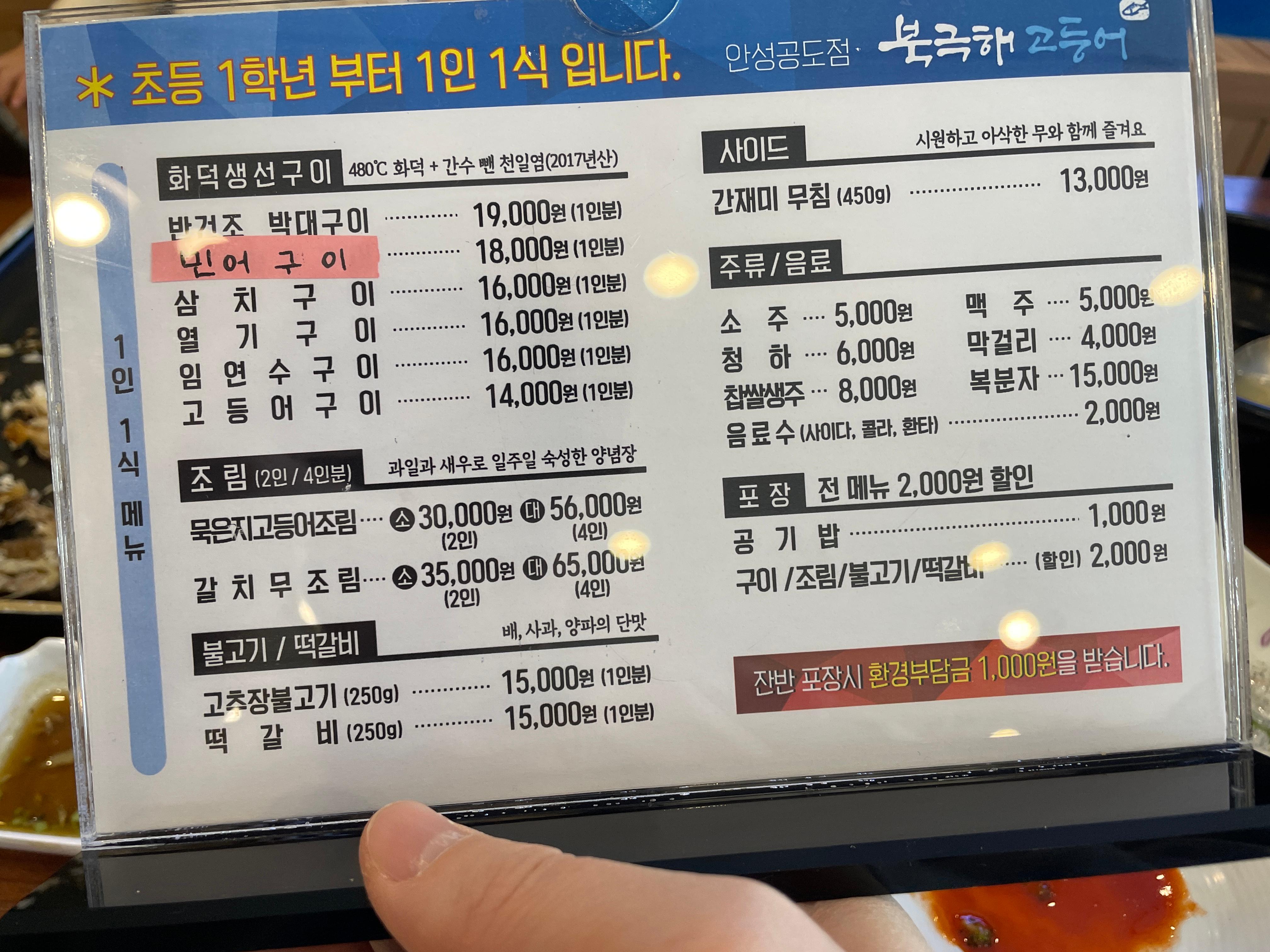 메뉴판은 요렇게 생겼다. 우리는 고등어 1, 삼치 1씩 주문했다. 합이 30,000원.