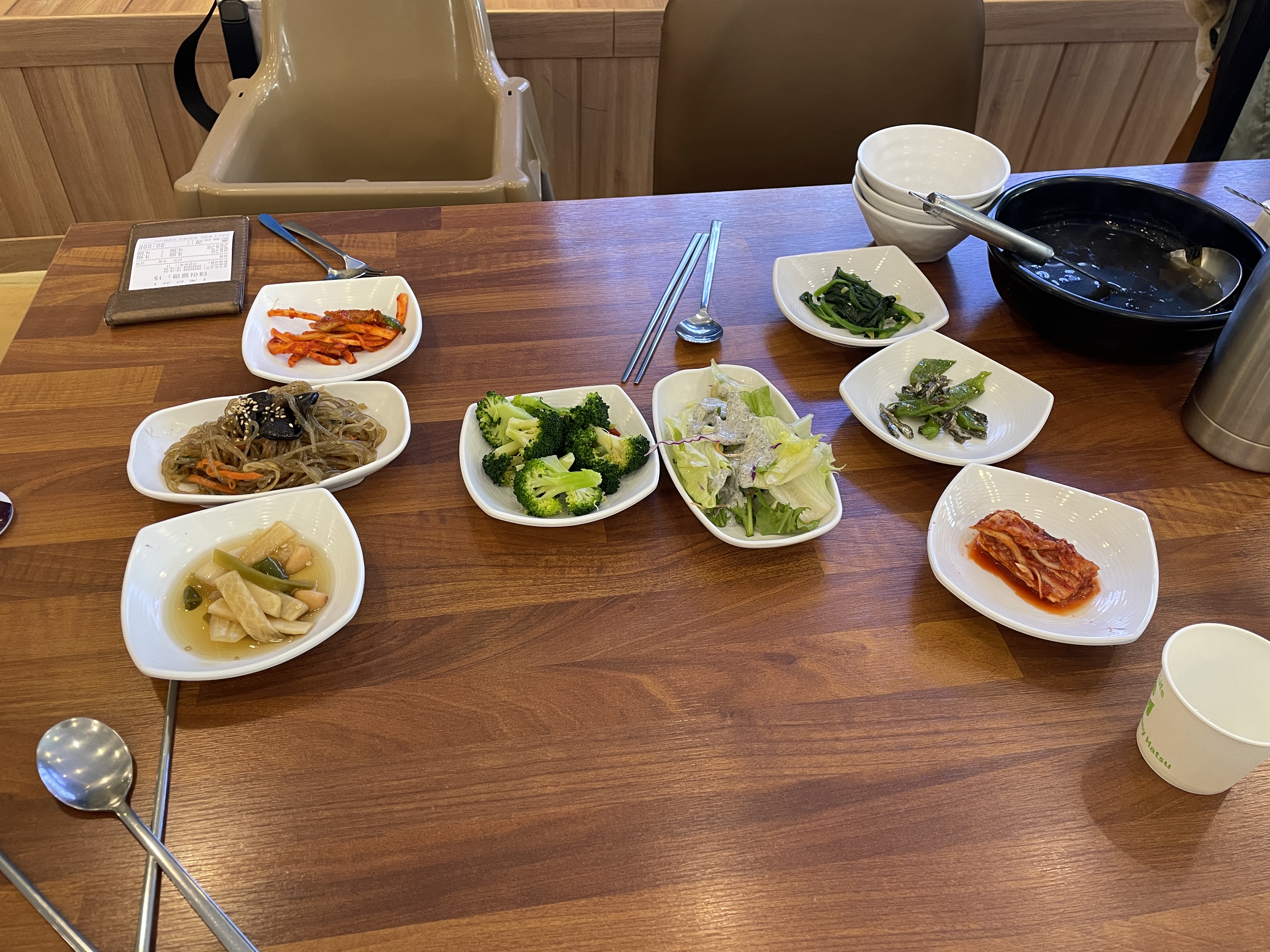 밑반찬이 나왔다. 미역국, 잡채, 장아찌, 도라지무침, 멸치, 시금치, 김치, 브로콜리, 샐러드.